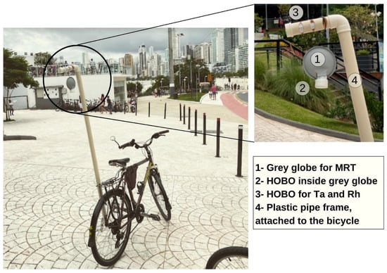 The bicycles used in the mobile transects were loaned by supporters of the research, living in the city of Balneário Camboriú, who became aware of the research through the disclosures that were made by the city’s media. For mobile measurements, two dataloggers of the HOBO® U23-001 model were used (Figure 5). One was used to carry out measurements of Ta and Rh, and the other was used to later calculate the MRT through the Ta data obtained by the globe thermometer (Tg).