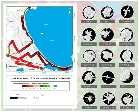 The map of the LCZs available in the city of Balneário Camboriú was obtained through the WUDAPT []. With the images taken by the “fisheye” lens and later using the RayMan Pro program, it was possible to obtain the SVF calculations. Both results are available in Figure 7.