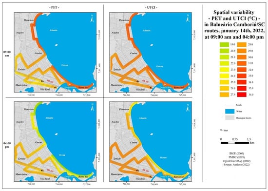Through Figure 9, it is possible to observe the map produced from the data obtained for PET and UTCI for 14 January 2022, for the two routes at 9:00 a.m. and 4:00 p.m. Table 1 presents the ranges of (dis)comfort found through the PET and UTCI indexes, as well as the percentage (%) present in the routes (Table 1).