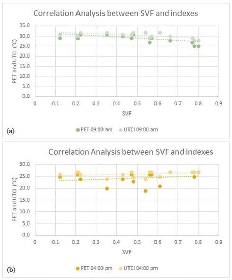 Figure 10a,b show the linear correlation between the values of the PET and UTCI indices, on the Celsius (°C) scale, and the SVF calculations obtained at the 15 points observed in Figure 8. In Figure 10, it is possible to observe that the values of the indexes represent the morning time (9:00 a.m.) and the analysis shows that, currently, there is a negative correlation between the SVF and the indexes; that is, the higher the SVF calculations, the lower the values are. Regarding values (°C) of the PET and UTCI indices in Figure 10, which shows the afternoon period, there is a positive correlation since the higher the SVF values, the higher the values of the PET and UTCI indices.