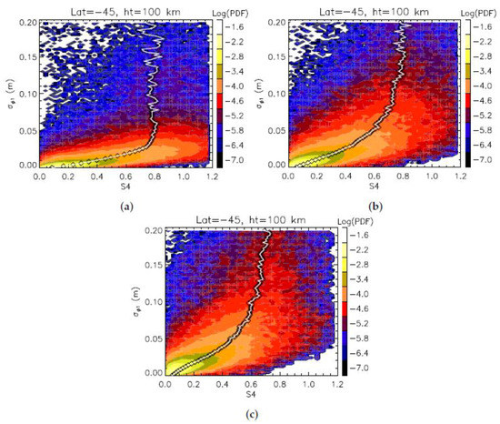 To analyze the GNSS-RO scintillation statistics associated with E, we focused on the mid-latitude measurements (−45° latitude) over a month-long period during the local summer (January 2008) at an E-region altitude of 100 km. These parameters were selected to maximize the likelihood of sporadic-E causing scintillation, which is known to occur mostly in the mid-latitudes during the local summer [15,17,18,19] at altitudes near 100 km [20]. While other ionospheric irregularities such as EPBs and polar cap electron density gradients are also known to cause significant satellite-based GNSS scintillation [6], our focus on mid-latitude measurements reduced the likelihood of these other ionospheric irregularities contributing to the observed scintillation (see [3] for more details). However, it did not completely remove the influence of equatorial and polar F-region irregularities. Furthermore, it is known that these ionospheric irregularities have a strong dependence on the local time and other geomagnetic and wind conditions [31,32,33,34,35], but here, we included all measurements taken during the month of interest to increase the total number of data points. By analyzing the scintillation at a single altitude instead of locating the maximum S or for each occultation, we sampled various regions of the diffraction patterns produced by the E layers with various altitudes centered around 100 km. This sampling was exactly what we attempted to simulate for comparison.