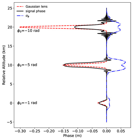Example simulations for Gaussian lenses with vertical thickness of 1.5 km and lens strengths of −1, −5, and −10 rad. The Gaussian lens strength is displayed along with the simulated signal phase and at the LEO measurement plane. Note that the different lenses were shifted by 10 km in altitude for readability, and a window of 2.2 km was used for the calculations.