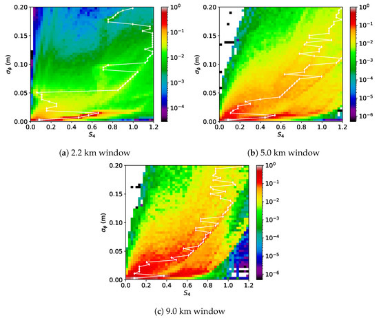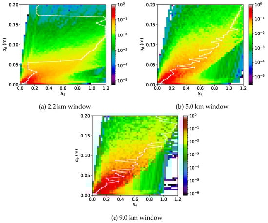 At the larger truncations (i.e., N = 121 and 201), where scintillations from thicker E layers were included, the S saturation was still evident, but it had a gradual transition from unsaturated to saturated. In these cases, the S values tended to approach the same mean at 0.8, and the statistics showed very few samples with S, especially for N = 201. The reduction in S for the larger windows was caused by the narrow E vertical thicknesses relative to the window lengths, which reduced the S values when scintillation did not occur over the entire window length. For , we saw an increase with increasing window lengths, which was due to larger-scale phase perturbations that were not captured using thin windows. More details on the phase and amplitude perturbations will be provided in Section 3.1. From this, there are benefits to using three different truncation windows for analyzing various intensity and phase perturbations.