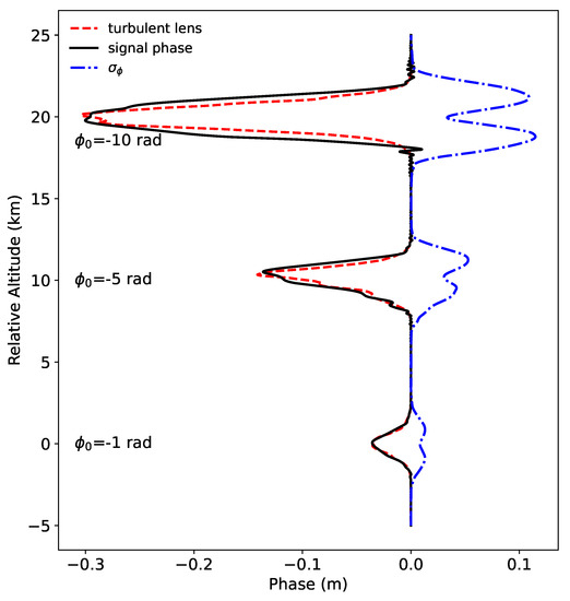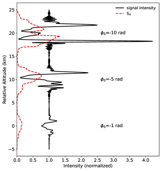 where is the phase contribution from the lens and is the peak lens strength [36]. For our simulations, we used an upper limit of to calculate the complex electric field at a distance of km after the lens, which is characteristic of RO geometry and the distance traveled to the LEO satellite after reaching the tangent point. A transverse resolution of was used for the simulations, where was the L wavelength.