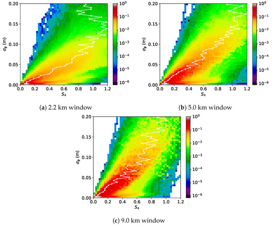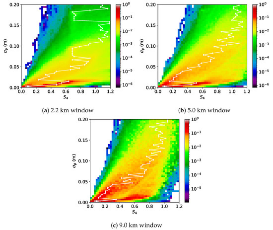 The second region of interest was produced by the moderate lenses, resulting in a roughly linear increase in with respect to S. For the 2.2 km window, this moderate lens zone was much weaker than the strong scintillation zone, but the strong scintillation linear trend from the origin to S, m roughly matched the observations in Figure 2. The moderate lens region was more obvious for the 5.0 km and 9.0 km windows, with a slope of 0.05/0.6 m for both windows. These slopes were in line with the observed slopes from the origin to m, although the observations showed a slightly elevated slope of 0.05/0.5 m for the 9.0 km window.