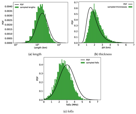 Probability distribution functions (PDFs) of the E lengths from the lognormal distribution outlined in [39], the vertical thicknesses from the lognormal distribution outlined in [20], and the foEs magnitudes from the Gaussian distribution outlined in [22], along with histograms of the 10,000 random samples used in the simulations.