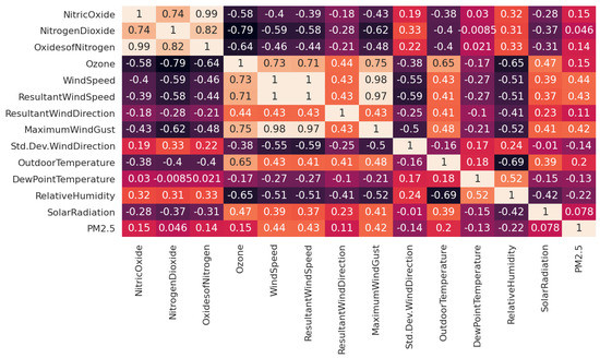 Figure 5 illustrates the correlation between all of the predictors of PM from the data set. Several meteorological variables, such as wind speed, resultant wind speed, and maximum wind gust, have a better positive correlation with PM. On the contrary, dew point temperature and relative humidity have a negative correlation with the target variable, i.e., PM. Figure 6 shows the scatter plot matrix with the slope values between the variables and a histogram of the diagonal element. This histogram provides a sense of the shape of the univariate distribution for each variable. Additionally, above each scatter plot, the slope of the linear fit is demonstrated with its statistical significance indicated by one asterisk (*) sign, which denotes p < 0.05, or two asterisk signs (**), which shows p < 0.01. As illustrated, with our target variable, PM, all pollutants are in positive associations, and there are statistically significant relationships between them.