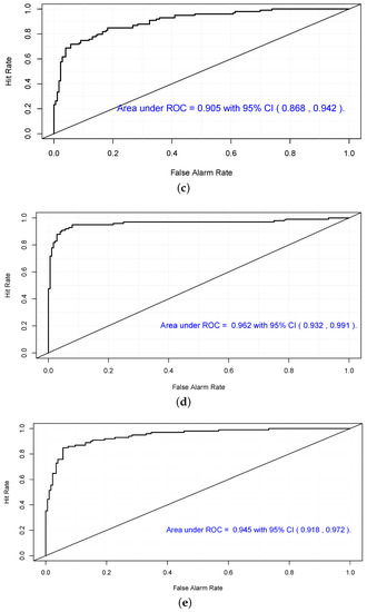 (a) ROC curve for logistic regression. (b) ROC curve for ridge regression. (c) ROC curve for MARS model. (d) ROC curve for random forest. (e) ROC curve for SVM kernel.