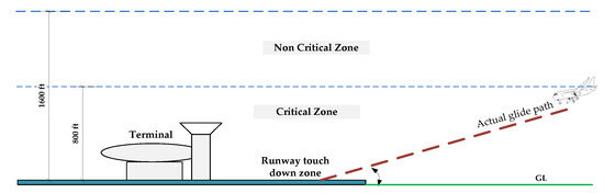 A substantial amount of wind shear data was essential to develop the prediction models. To this end, 243 LLWS data were obtained from the PIREPs and HKO weather reports. The PIREPs were used to ascertain the LLWS height and intensity as well as the runway that arriving and departing aircraft used. As depicted in Figure 3, the occurrence location of LLWS was divided into two zones—the critical zone and the non-critical zone—based on the PIREPs. All LLWS events occurring within 800 ft of the surface were deemed critical, whereas all others were deemed non-critical. An LLWS event was therefore a binary factor with two possible outcomes as indicated by Equation (1):