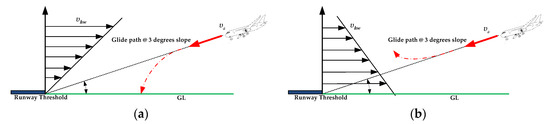 The cockpit remains extremely active during the landing phase, and the captain and co-pilot must make a number of quick decisions to complete their landing checklist. However, poor weather conditions, complex terrain, and the presence of buildings near the airport will increase turbulence along the glide path. Therefore, the occurrence of LLWS below 800 feet above the ground is regarded as the most critical phenomenon for both approaching and departing aircraft. The pilot must contend with violent updrafts and downdrafts as well as abrupt changes in the aircraft’s horizontal and vertical movement while completing the landing checklist. As depicted in Figure 1, this critical condition may lead to a missed approach, landing short of the runway (loss of lift), or deviation from the actual flight path during final approach. Basically, there are two detrimental and potentially hazardous effects of LLWS on approaching aircraft: perturbation of the glide path and deviancy of the approach speed from the established (set) value [3]. As a result, the pilot may perceive additional pressure during the approach phase when the engine power is low and the airspeed is close to stall speed due to unexpected changes in wind direction or speed. This effect of declining and raising headwind shear on an aircraft during an approach is depicted in Figure 2 (assuming no pilot intervention is being used); both scenarios utilize a conventional instrument landing system with a 3-degree glide path and final approach speed . In the first scenario (Figure 2a), the approaching aircraft is subjected to a declining headwind with the headwind speed . As the aircraft approaches the ground, its airspeed (the aircraft’s speed in relation to the surrounding air flow) declines, thereby lowering lift and tending to result in a greater descent angle due to the transient force imbalance. In this scenario, the aircraft may possibly land short of the runway. The second case (Figure 2b) assumes a rising headwind on the same glide path and slope (3 degrees). As a result, the aircraft’s airspeed increases in relation to the surrounding air flow, thereby generating more lift and resulting in a flatter angle of descent or even a climb. In this scenario, landing may possibly be aborted and a go-around initiated.