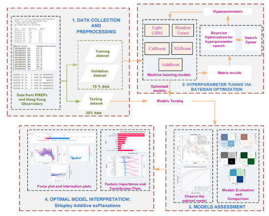 In comparison to prior hardware-based techniques and numerical and simulation models, we proposed in this study to use Bayesian Optimization–Ensemble Learning Classifiers (BO-ELCs) to predict the criticality of LLWS events. ELCs have been applied in a number of fields, including health care modeling, transportation and traffic safety, finance, and economics [13,14,15,16,17,18,19,20]. However, there is a significant gap in the literature regarding the use of ELCs in the civil aviation safety domain. In the past, Liu et al. [21] developed a neural-network-based prediction model for the assessment of wind fields along the glide path near HKIA using LiDAR data. It was quite effective at predicting wind shear. However, one could argue that neural network models are difficult to comprehend since their structures or weights include only a limited amount of information about the estimated function [22,23]. On the other hand, decision-tree-based machine learning models are easy to understand and their outcomes can be easily explained. The models empower predictive models with high accuracy and stability. The predictions of ELCs do not, however, explicitly and clearly demonstrate the relationship between changes in input and output variables, in contrast to statistical or empirical models. The interpretation of the model is equally important for appropriately assessing the model’s performance. Previously, the ELC results were interpreted using the variable-importance analysis technique. The variable-importance analysis methodologies, however, can only provide a ranking of the variables’ importance and are unable to explain how each variable individually influences the prediction of model. The SHapley Additive exPlanations (SHAP) algorithm, which is based on the concept of game theory [24], has been utilized in recent studies to quantify each variable’s effect on the outcomes and to provide information about the strength and direction of each variable’s influence on each individual sample [25,26,27,28,29,30]. Civil aviation safety researchers should take advantage of this opportunity because understanding the complex interactions between several risk factors that determine the criticality of LLWS is crucial for aviation and meteorological applications.
