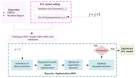 In this work, BO was utilized in conjunction with ELCs to train and tune the ELCs and find the optimal hyperparameters. The BO assembled a probability model for finding the value that automatically diminished the objective function based on the precedent estimation outcome of the objective. Figure 5 shows the flowchart of the hybrid BO-ELC approach. The step-by-step procedure for ELC optimization via BO is also given below.