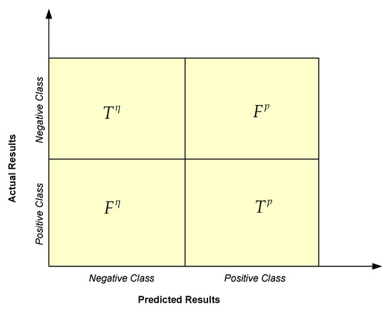 In addition, we also used a confusion matrix, which provided an in-depth examination of the model’s performance when predictions were made for each class. For the binary classification problem, one class was the majority (the negative) and its sample size was represented by ; the other class was the minority (the negative) and its sample size was represented by . Let represent the total size of the training data set (). The binary classifier predicted whether each instance was positive or negative. Therefore, it generated four types of outcomes: true positive , false positive , true negative , and false negative (see Figure 6). The Accuracy, Recall, Precision, and F1-score were extracted from the confusion matrix and are given as Equations (9)–(12).