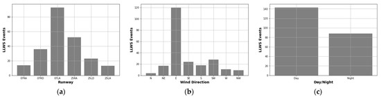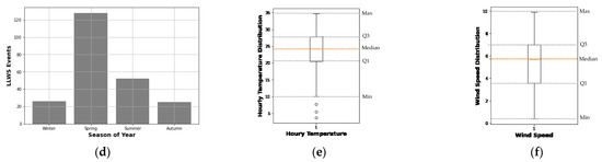 (a) LLWS events with respect to runway; (b) LLWS events with respect to wind direction; (c) LLWS events with respect to day/night; (d) LLWS events with respect to season of year; (e) box plot of hourly temperature; (f) box plot of wind speed.