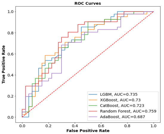 To assess the performances of the BO-ELCs, the ROC curves were plotted and the AUC-ROC was calculated for each ensemble classifier. The AUC-ROC curves were used to provide a basis for the comparison between each classifier. Figure 8 demonstrates that all models utilized showed strong predictive values. All the developed classifiers showed AUC-ROC values greater than 0.50. The most accurate classifier among all of the classifiers was the BO-Random Forest model, which had an AUC-ROC of 0.759. The worst AUC-ROC was shown by BO-AdaBoost, which was equal to 0.687.