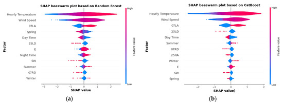 SHAP beeswarm plots: (a) Random Forest; (b) CatBoost.