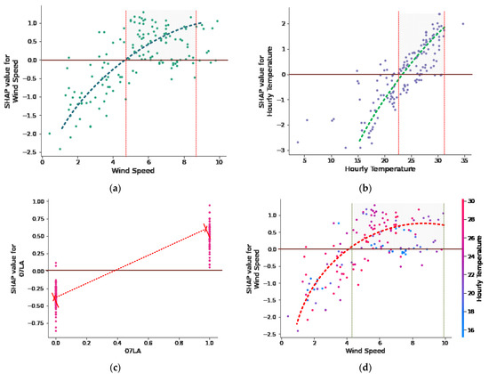 The dependence and interaction plot examines the top three influential factors; namely, hourly temperature, wind speed, and Runway 07LA. Other factor interactions, however, could be explored as well. Figure 12a depicts the effect of wind speed on the models’ predictions. The points with high density fell above the SHAP 0.0 reference line and at wind speeds of more than 4.4 m/s up to 8 m/s had a positive impact on the prediction of LLWS, which meant that wind speeds higher than 4.4 m/s were more likely to cause C-LLWS events. The results were consistent with the findings of previous studies [41,42]. However, it is pertinent to mention that for the occurrence of C-LLWS events, the variation in wind speed is more important than the mean wind speed. The duration of a C-LLWS event that might be encountered by an aircraft is generally within a few seconds to a few minutes. Therefore, the hourly mean wind speed can hardly provide an accurate indication of LLWS criticality. Therefore, more refined data on wind conditions such as a 1 min mean in turbulence intensity may be required to improve the models’ accuracies.
