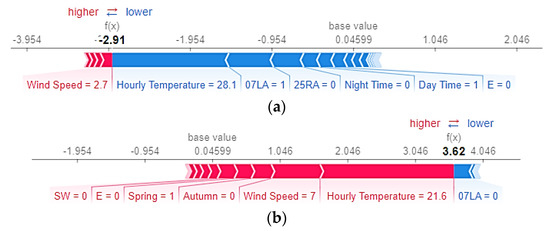 SHAP explanatory force plots: (a) plot of case with a value equal to 0.291; (b) plot of case with a value equal to 3.62.