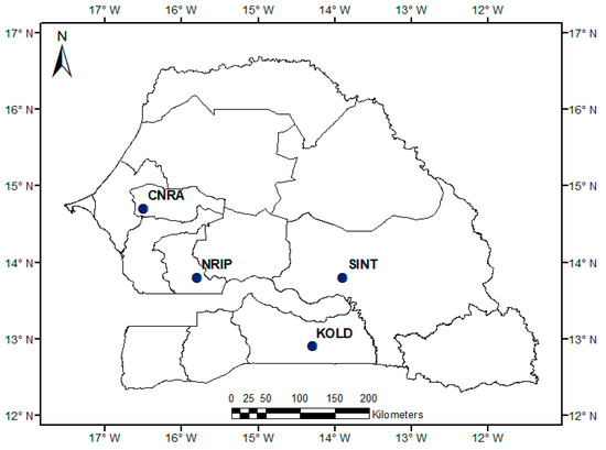 Locations of the four target experimental research stations managed by ISRA. CNRA, NRIP, SINT and KOLD represent Bambey, Nioro du Rip, Sinthiou Malème and Kolda, respectively.