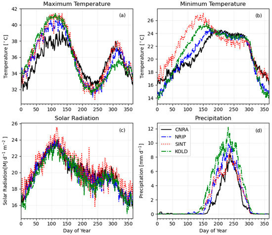 Mean seasonal cycle of weather variables at four target weather stations from 1981 to 2015: (a) daily Tmax, (b) daily Tmin, (c) daily Solar radiation, and (d) 7-day precipitation moving average. Refer to Figure 1 for the full names of the legend.
