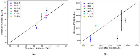 We used the genetic coefficients of Fadda, one of the most popular hybrids, as calibrated by Ganyo et al. [40,43,44] (Table S2). The calibration was based on the 2 years of field experimental data to see the effect of fertilization strategies on representative sorghum cultivars in Senegal. We further validated the calibrated sorghum model, focusing on the experiments with recommended fertilizer management. First, the performance of the calibrated model was evaluated by computing mean absolute error (MAE), root-mean-square error (RMSE), and normalized RMSE (nRMSE) (Equations (A1) and (A2)). The MAE, RMSE, and nRMSE for anthesis were 5, 6 days, and 6.6%, respectively. For the yield, the MAE, RMSE, and nRMSE were 685, 852 kg ha−1, and 60.9%, respectively. Due to small sample datasets (e.g., n ≤ 11), in this study, we considered an nRMSE ≤ 15% as “good” agreement; 15–30% as “moderate” agreement; and ≥ 30% as “poor” agreement [45,46,47]. Anthesis prediction of the model was in “good” agreement, being well-aligned along the 1:1 line in Figure 3. The yield prediction skill was poor (Figure 3b). However, the case of “Nioro du Rip 2016 Irrigated (N16-I)” had an unreasonably low yield in Figure 3b, lower than the national average sorghum grain yield in Senegal (i.e., 888 kg ha−1) despite supplemented irrigation (at least 30 mm per week) with a sufficient fertilizer amount [43]. Ganyo et al. [43] attributed the meager yield to the site’s low yield potential and fertilizer application timing. When the N16-I case was excluded, the nRMSE was improved to the “moderate” agreement, 30%. Note that high standard deviations (e.g., more than 1000 kg ha-1 in the case of S15-R and N15-R) in Figure 3b indicate considerable uncertainty in the yield measurements, even in well-controlled field experiments by ISRA, and thus difficulties in fitting the model-predicted yields to the observed.
