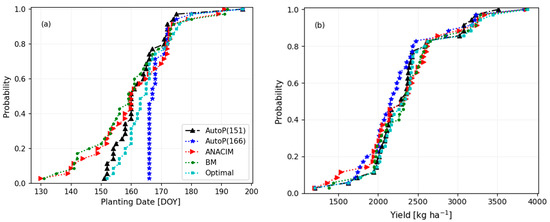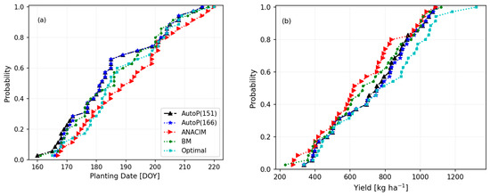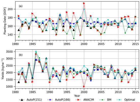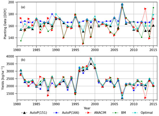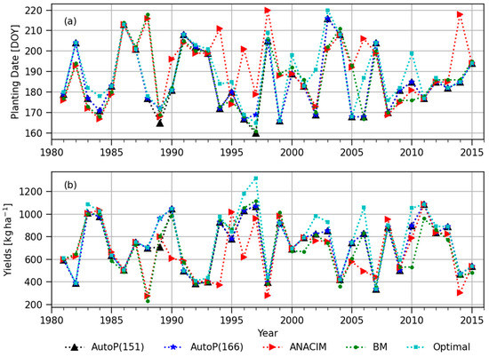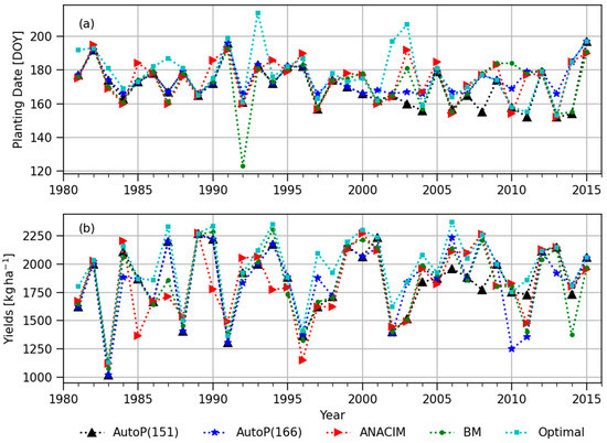 Both the ANACIM and BM definitions generated very early planting dates, even in May in several years, but these unusually early planting dates did not cause low yields, unlike the negative effects of the late planting. The AutoP(166) starts to count planting windows from DOY 166, not allowing earlier planting before DOY 166. This threshold date (DOY 166) hampers the potential yield as indicated in the significant difference between the mean and 75th percentile of simulated yields between the AutoP(166) and the semi-optimal (Table 1 and Figure 11b). Therefore, in SINT, farmers seem to be able to move planting dates forward (earlier than DOY 166) with lower risks, rather than sticking to the traditional planting window (i.e., June 24 to July 11 in Diop [52]) or delaying the planting dates.