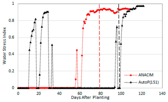 Simulated water stress indices in 1988 with ANACIM and AutoP(151) onset definitions in CNRA. Note that the water stress index is computed as 1 minus water deficiency, where water deficiency is the ratio of supply to potential demand. The higher water stress index indicates less water supply for root water uptake hindering crop growth. Vertical dashed lines indicate anthesis dates.