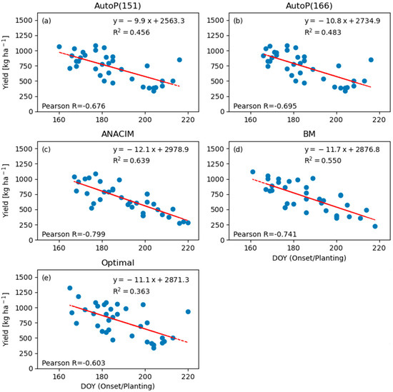 Relationships between estimated onset dates (day of year) and simulated sorghum yields in CNRA for different onset definitions: AutoP(151) (a), AutoP(166) (b), ANACIM (c), BM (d), and Optimal (e).