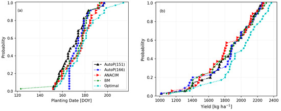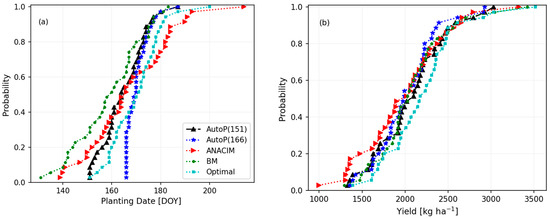 Cumulative distribution of (a) estimated onset/planting dates and (b) corresponding simulated sorghum yields (1981–2015) in NRIP.