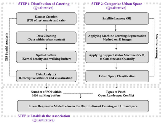 This mixed-method quantitative research includes three parts: (1) uses Open Street Map data and the GIS spatial analysis method to study the distribution of catering businesses; (2) uses the imagery segmentation method in machine learning to categorize urban spaces into open, landscape, and conflict spaces; and (3) establishes the association between the distribution of catering businesses and the categories of urban spaces through Spearman’s correlation and a linear regression model.