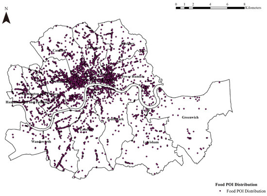 The data set of catering POIs is derived from the Open Street Map (OSM) platform and manually cleaned up in ArcGIS. OSM has been widely used as a data source for big data projects, providing multi-vector data, including POIs, street networks, land use, etc. [27,39]. The POI in OSM includes name, geographical coordinates, and type information, which can be located and reclassified in ArcGIS. This study obtained the latest POI data for London released by OSM in 2022.