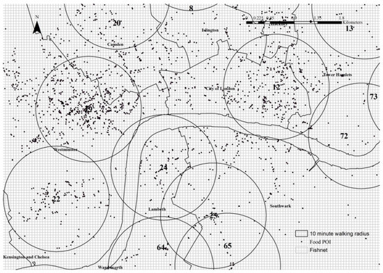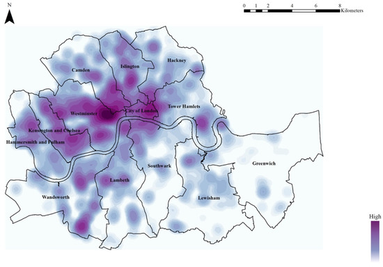 The kernel density (geometrical interval) result (Figure 3) indicates the density of catering POIs in its borough. The distribution of catering POIs is unequal among the boroughs. Westminster has the highest density and Greenwich has the lowest density of catering POIs. This study defines 74 high-density food hubs among 12 boroughs.