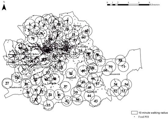 Previous research has used spatial distribution and pattern analysis to identify and measure urban public areas. Points of interest (POI) are the locations where people gather and conduct daily activities [10]. Understanding the POI arrangements of various urban zones (e.g., administrative districts, neighborhoods, commercial areas, planning areas, metro station areas, and so on) is helpful for urban planners, investors, advertisers, and residents. Urban planners may assess regions’ functionality, vitality, and advancements by analyzing their POI arrangements [11]. The walking buffer concept is a spatial buffering technique used to analyze the spatial layout of urban spaces by breaking them down into small units [6]. A 1 km network buffer has been used to collect built environment data and calculate the walkability index [12]. The 400, 800, and 1600 m buffer sizes are also frequently used to study walkability in the context of the 5, 10, or 20 min city or neighborhood unit [6,13]. The distribution of catering POI and buffer zones can represent the food situation and be visualized on a map through a geographic information system (GIS).