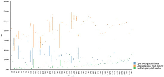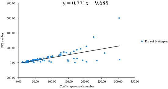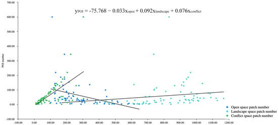 More specifically, the correlation coefficient between the POI number and the open space patch number was −0.403 and showed significance at the 0.01 level, thus indicating that there was a significant negative correlation between the POI number and the open space patch number. The correlation coefficient between the POI number and the landscape space patch number is 0.166, which is close to 0, and the p-value is 0.158 > 0.05, thus indicating that there is no correlation between the POI number and the landscape space patch number. The correlation coefficient between the POI number and the conflict space patch number was 0.641 and showed significance at the 0.01 level, thus indicating that there is a significant positive correlation between the POI number and the conflict space patch number.