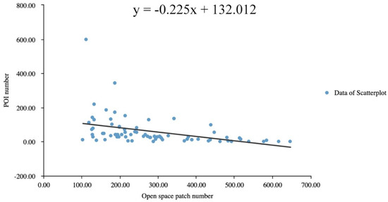 From Table 4, the correlation analysis was used to investigate the correlation between the POI number and the open space patch number, landscape space patch number, and conflict space patch number, respectively, and the Pearson correlation coefficient was used to indicate the strength of the correlation.