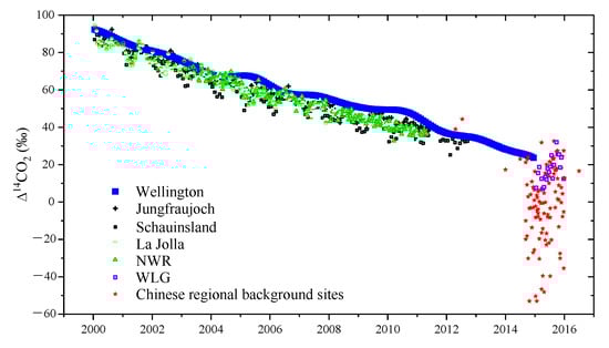 In Europe, Jungfraujoch (JFJ) and Schauinsland (SIL) are the two most representative background sites. Jungfraujoch is located in the Swiss Alps at an elevation of 3450 m a.s.l. and mostly samples air from the free troposphere over []. Schauinsland is in Black Forest, Germany, with an elevation of 1205 m a.s.l. Schauinsland normally samples free tropospheric air during the night but is influenced by boundary layer air during the day []. The two stations all use 2-week integrated CO2 samples collected by NaOH solution absorption. Levin et al. [] found Δ14CO2 in both sites showed a steady decreasing trend, about 6‰ per year at the beginning of the 21st century and 3‰ per year on average in 2009–2012. The seasonal features of Δ14CO2, they are similar for nearly all the background sites, with maxima recorded during summer/autumn and minima during winter/spring.
