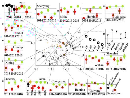 To provide a periodical review of the spatiotemporal characteristics of FFCO2, we collected Δ14CO2 measurements of air and plant samples and/or the calculated FFCO2 reported in the past two decades (Table 1). Since measurements in Europe and North America have been implemented for decades, we focus more on the recent measurements in Asia (Figure 2, where CO2 emissions are higher than in other regions []). The global FFCO2 distribution is plotted in Figure 3.