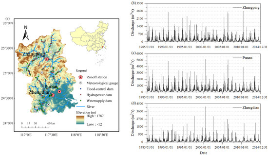Study area in the Jiulong River basin (a) and the hydrographs of hydrological stations in Zhangping (b), Punan (c) and Zhengdian (d).