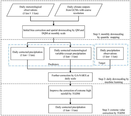 (2) The second step is daily correction by machine learning. This study selected the GA-NARX [32,62] method to perform further correction for precipitation. As a class of recurrent neural networks, GA-NARX is regarded as a suitable method for nonlinear dynamic time series prediction, and a detailed description can be found in [32,62]. In this study, the predictors of GA-NARX include the QM/DQM-corrected daily rainfall, mean/maximum/minimum temperature, relative humidity and wind speed, and the target is the observed precipitation. Similar to other machine learning methods based purely on data, GA-NARX always underestimates high values [63] due to the sigmoidal activation function and insufficient training with limited high values in the time series [31,32,64]. This drawback can significantly affect the projection of future floods and needs to be overcome.