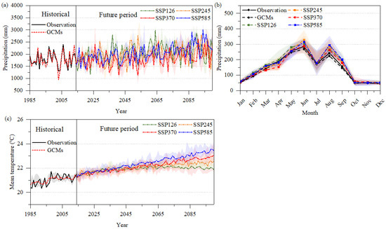 The changes in annual mean precipitation (a) and air temperature (c) from the ensemble mean of corrected GCMs under the four SSP–RCPs for the period 1985–2100 and the mean monthly precipitation (b) for the period 2015–2100, while the observations (solid black line) are calculated for the period 1985–2014.