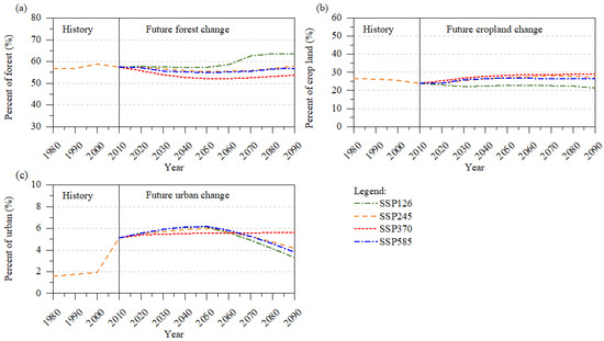The percent changes of three main land use types (forest (a), cropland (b) and urban (c) areas) with decadal land use changes projected by the CA–Markov model for the 2020-2090 period under the four SSP–RCPs. The land use changes in the historical period (1980–2010) are based on the observed land use maps.