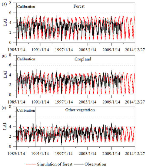 The comparison between the daily simulated areal mean LAI by the Biome-BGC model and the half-monthly remote sensing-based LAI (referred to as the observation in the figure) for forest (a), cropland (b), and other vegetation (c).
