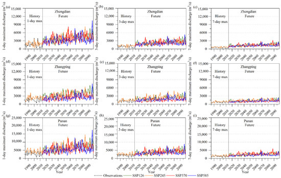 Simulated annual 1-day maximum, 3-day maximum and 7-day maximum river discharges in the historical period and under the future SSP–RCPs at Zhengdian (a–c) station, Zhangping station (d–f) and Punan station (g–i).