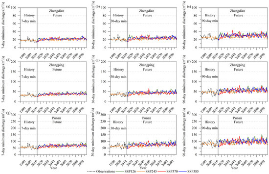Simulated annual 7-day minimum, 30-day minimum and 90-day minimum river discharges in the historical period and under the future SSP–RCPs at Zhengdian (a–c) station, Zhangping station (d–f) and Punan station (g–i).