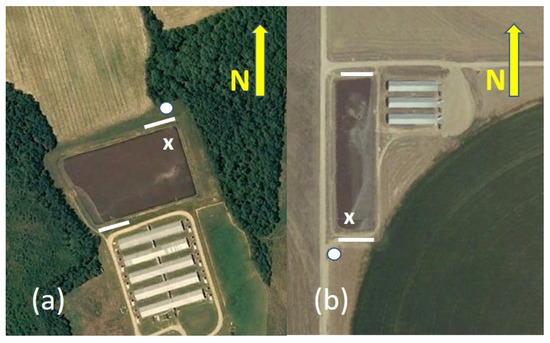 The North Carolina finisher facility consisted of five barns, an office and a waste lagoon (Figure 1a). The facility had a capacity of 8000 finishing pigs in five units [12]. Construction of the farm was completed in 1996. Manure from the barns was transferred daily to the lagoon by pull plug and lagoon water recharge. Wastewater combined into one inlet. The rectangular waste lagoon was located to the north and was separated by a drainage swale from the barns. The lagoon area was 18,987 m2 and volume was 45,973 m3. Maximum liquid depth was 3.3 m. Wastewater was removed for irrigation as weather permitted. Sludge from the lagoon had not been removed since construction (15-year sludge removal cycle) and was approximately 0.3 m thick. Producer-reported activity is provided in Table 1.