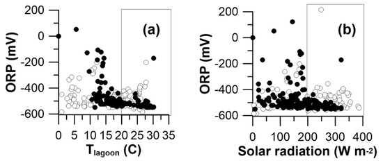 Oxidation-reduction potential: (a) The relationship of daily mean lagoon temperature to oxidation-reduction potential in NC (filled circles) and OK (open circles) lagoons; (b) The relationship of daily mean solar radiation to oxidation-reduction potential in NC (filled circles) and OK (open circles) lagoons. Conditions conducive to PSB development is indicated by boxed region.
