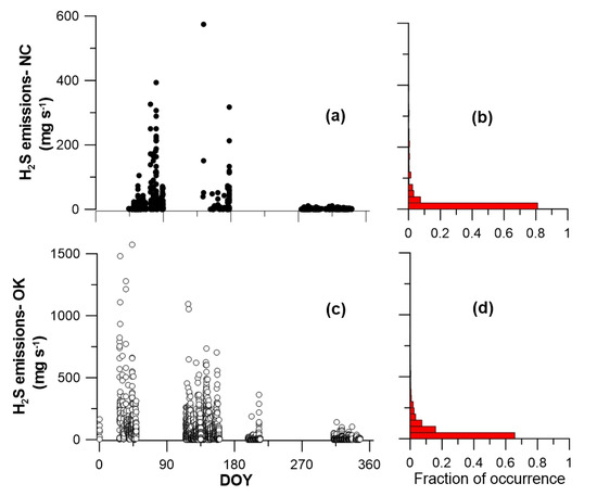Emissions were generally greater in the first half of the year at both lagoons (Figure 3a,c). Emissions were also strongly positively skewed at both lagoons (Figure 3b,d). The mean measured emission at the NC lagoon was 9.59 mg H2S s−1 (0.53 µg H2S m−2 s−1) while the median emission was 0.14 mg H2S s−1 (0.01 µg H2S m−2 s−1). The mean measured emission at the OK lagoon was 49.99 mg H2S s−1 (5.12 µg H2S m−2 s−1) while the median emission was 11.68 mg H2S s−1 (1.20 µg H2S m−2 s−1). Emissions at the NC lagoon were more commonly near zero than at the OK lagoon (Figure 3b,d), with 657 of the 1160 measurements at the NC lagoon and 2936 of the 3527 measurements at the OK lagoon above zero. Considering only positive emissions, the mean emissions at the NC lagoon were 18.69 mg s−1 (1.04 µg H2S m−2 s−1) while those at the OK lagoon were 62.79 mg H2S s−1 (6.43 µg H2S m−2 s−1). The 90th percentile of emissions at the NC lagoon was 46.30 mg H2S s−1 (2.57 µg H2S m−2 s−1) while that at the OK lagoon was 163.30 mg s−1 (16.72 µg H2S m−2 s−1).