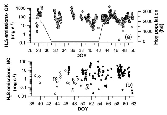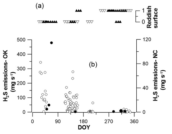 Annual variation in daily emissions (representative days) and observed lagoon coloration: (a) The daily lagoon surface color; (b) H2S emissions. Values are indicated for the NC lagoon (closed symbols) and OK lagoon (open symbols).