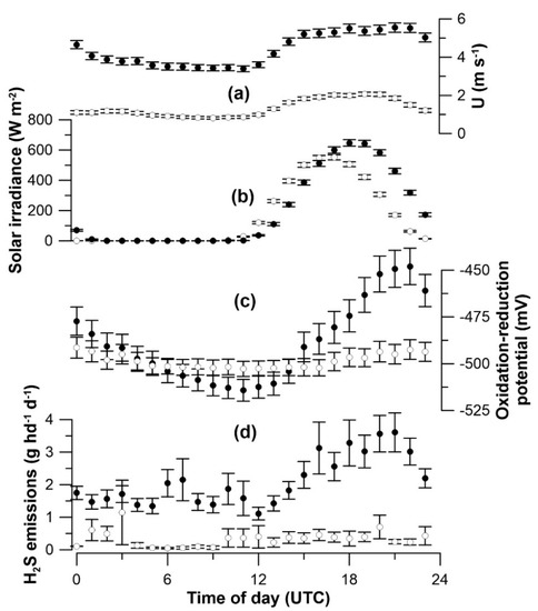 The diurnal variation in winds, solar radiation, ORP and mean emissions when the lagoon was not reddish (no evidence of PSB). The hourly mean values with error bars of standard error of the mean for the NC (open circles) and OK (filled circles) are indicated for the wind speed (a), solar irradiance (b), lagoon oxidation reduction potential (c) and emissions (d).