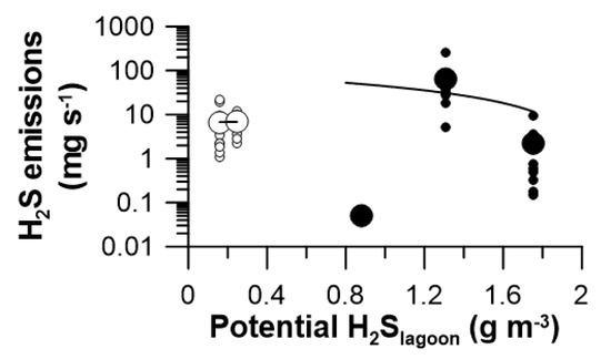 Wind shear at the lagoon surface promotes the emission of both dissolved H2S and H2S contained in bubbles lying under a surface film (through bursting). The wind speed, as a proxy for this process, was related to daily mean emissions using Grapher® 11.9 (Golden Software, LLC, Golden, CO, USA) according to the power law: